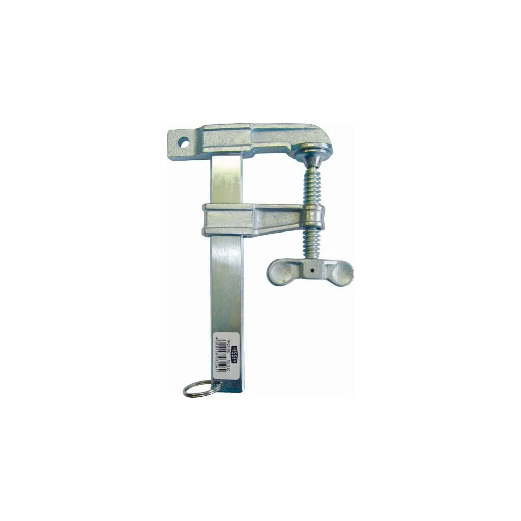 Polschraubzwinge mit Bügel aus Temperguß und verzinkter Profilschiene mit den Maßen x 8 mm.