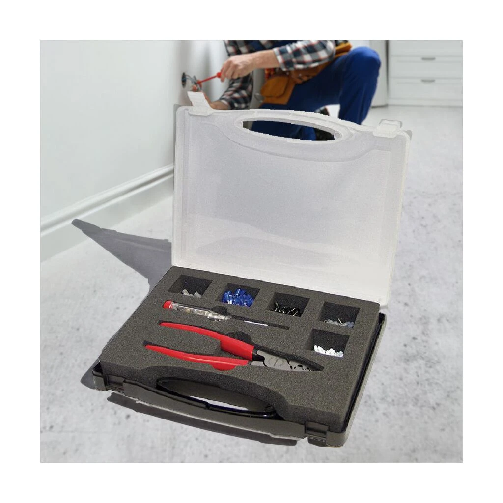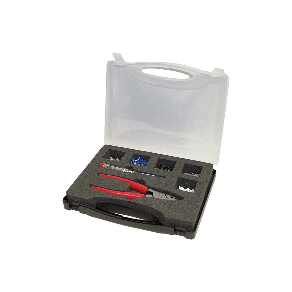 Ausführung: Aderendhülsen mit Kunststoffkragen, Leiterquerschnitt von 0,5 bis 4 mm². Lieferung in Kunststoffkassette.