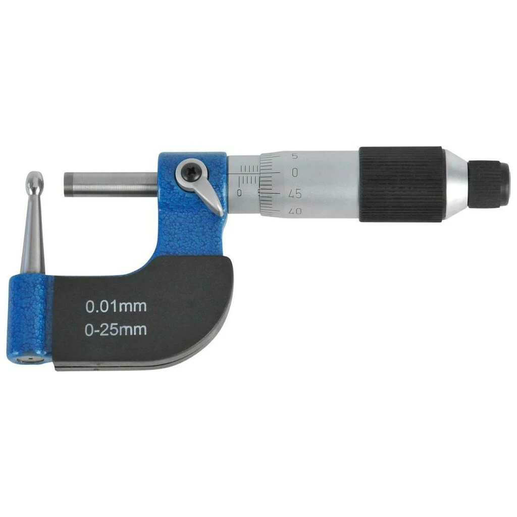 Ausführung: Ableseteile matt verchromt, Spindel gehärtet und geschliffen, Messkraftregelung durch Gefühlsratsche, mit balligem Amboss Ø 4,7 x 27 mm. Lieferung im Etui.
