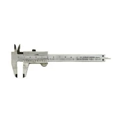 Ausführung: Aus rostfreiem Stahl, gehärtet, Ableseteile und Nonius matt verchromt, mit rechteckigem Tiefenmaß, Rückseite mit Gewindetabelle.