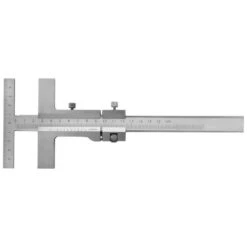 Ausführung: Aus Stahl, gehärtet. Ableseteile und Nonius matt verchromt, mit gehärteten Anreißkanten und langer, T-förmiger Anreißschiene, mit Feststellschraube und Feineinstellung. Lieferung im Holzkasten.