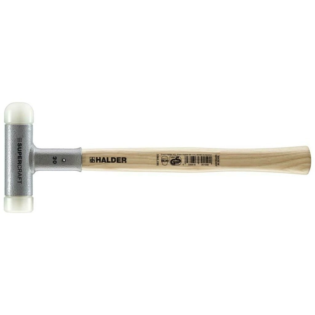 Ausführung: Hammerkörper aus Stahl, rückschlagfrei durch Kugelfüllung. Die cadmiumfreien Nyloneinsätze sind auswechselbar. Mit lackiertem Hickorystiel.