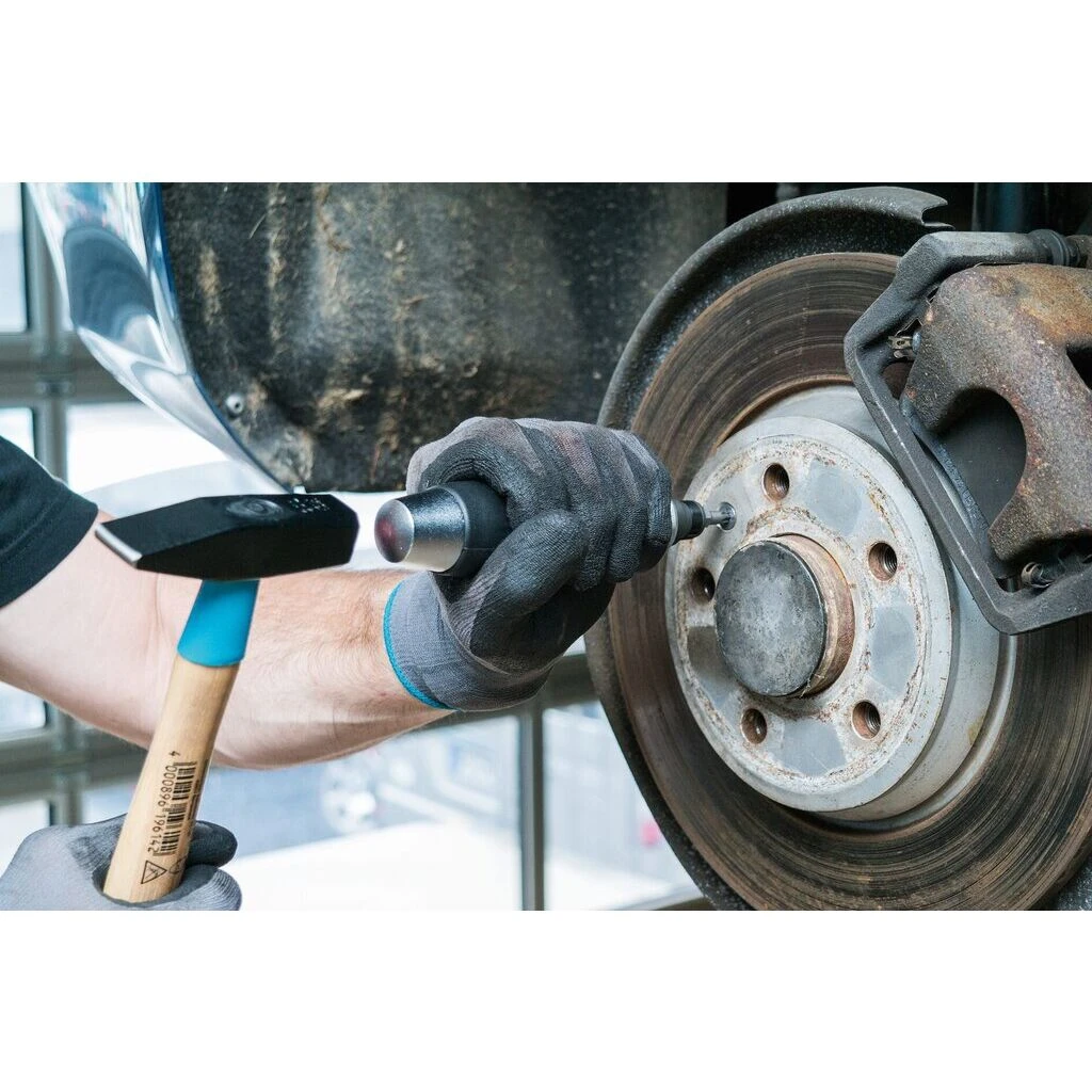 - Schlagschraubendreher-Griff vor jedem Schlag zum Vorspannen nach links (Lösen bzw. Rechtsgewinde) bzw. rechts (Anziehen bzw. Linksgewinde) drehen. Mit 300 g Hammer auf die Kopfseite des Schlagschraubendrehers schlagen