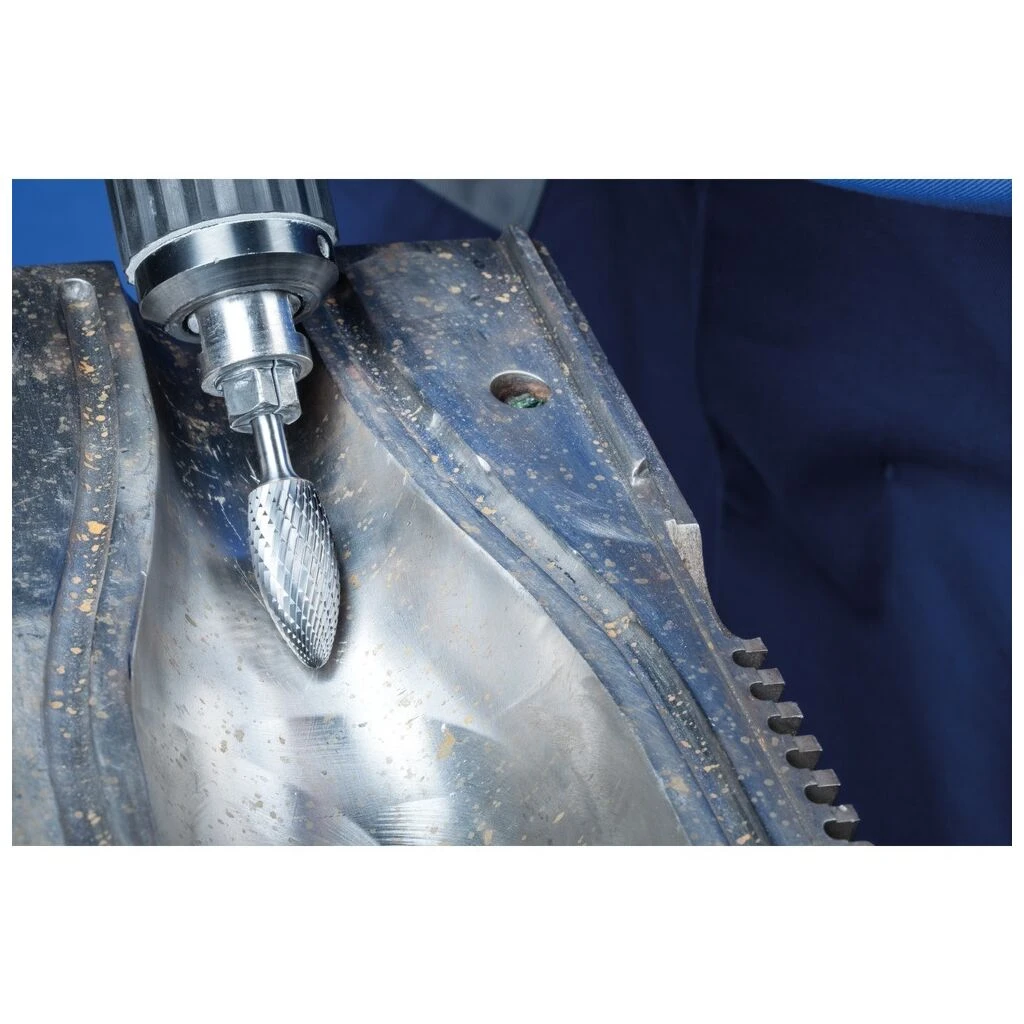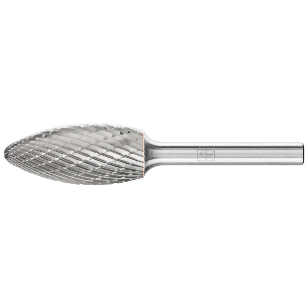 Zahnung 3 PLUS ist kreuzverzahnt und eignet sich besonders gut zur Zerspanung von Gusseisen, Stahl, Edelstahl (INOX), Nickelbasis- und Titanlegierungen. Sie zeichnet sich durch einen hohen Materialabtrag aus. Hartmetallfrässtifte für universelle Anwendungen eignen sich zur Fein- und Grobzerspanung auf den wichtigsten industriell verwendeten Werkstoffen. Sie bieten eine gute Zerspanungsleistung und können werkstoffübergreifend eingesetzt werden. Flammenförmiger Frässtift nach ISO 7755/8 mit Verzahnung nach DIN 8033.