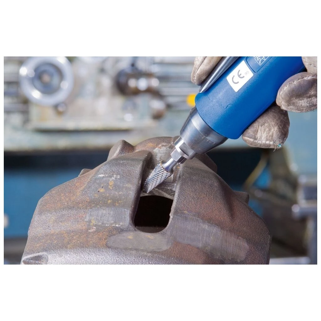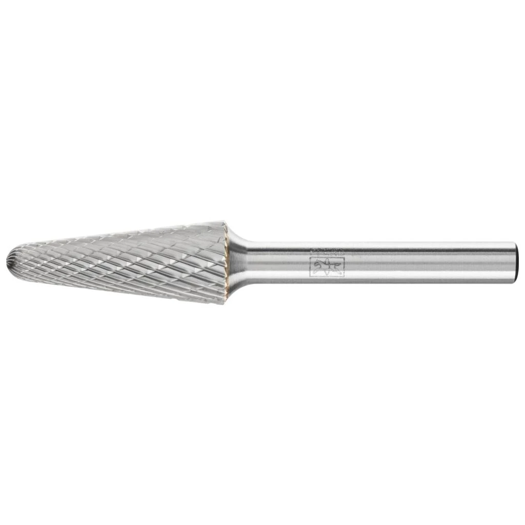 Zahnung 3 PLUS ist kreuzverzahnt und eignet sich besonders gut zur Zerspanung von Gusseisen, Stahl, Edelstahl (INOX), Nickelbasis- und Titanlegierungen. Sie zeichnet sich durch einen hohen Materialabtrag aus. Hartmetallfrässtifte für universelle Anwendungen eignen sich zur Fein- und Grobzerspanung auf den wichtigsten industriell verwendeten Werkstoffen. Sie bieten eine gute Zerspanungsleistung und können werkstoffübergreifend eingesetzt werden. Rundkegelförmiger Frässtift mit runder Kuppe nach DIN 8032 und Verzahnung nach DIN 8033.