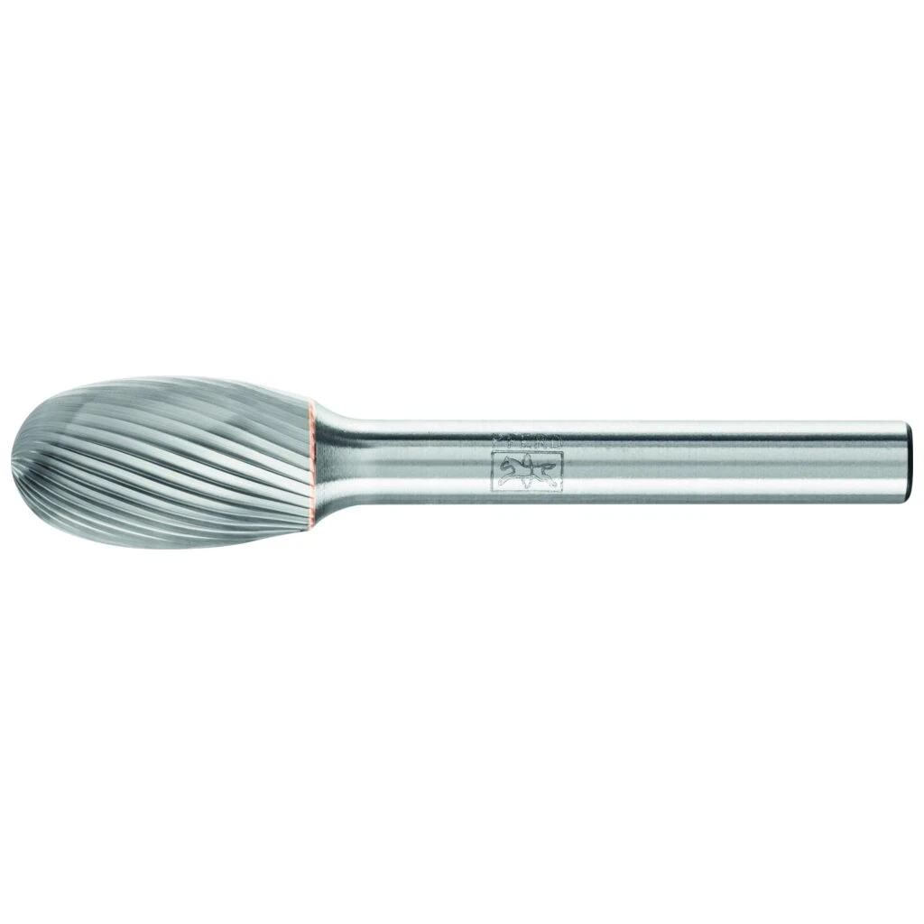 Zahnung 5 eignet sich besonders gut zur feinen Zerspanung von Gusseisen, Stahl, Edelstahl (INOX) und hochwarmfesten Werkstoffen wie Nickelbasis-, Kobaltbasislegierungen. Sie erzeugt gute Oberflächen. Hartmetallfrässtifte für universelle Anwendungen eignen sich zur Fein- und Grobzerspanung auf den wichtigsten industriell verwendeten Werkstoffen. Sie bieten eine gute Zerspanungsleistung und können werkstoffübergreifend eingesetzt werden. Tropfenförmiger Frässtift nach DIN 8032 mit Verzahnung nach DIN 8033.