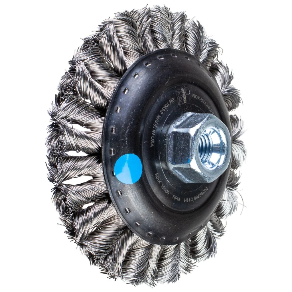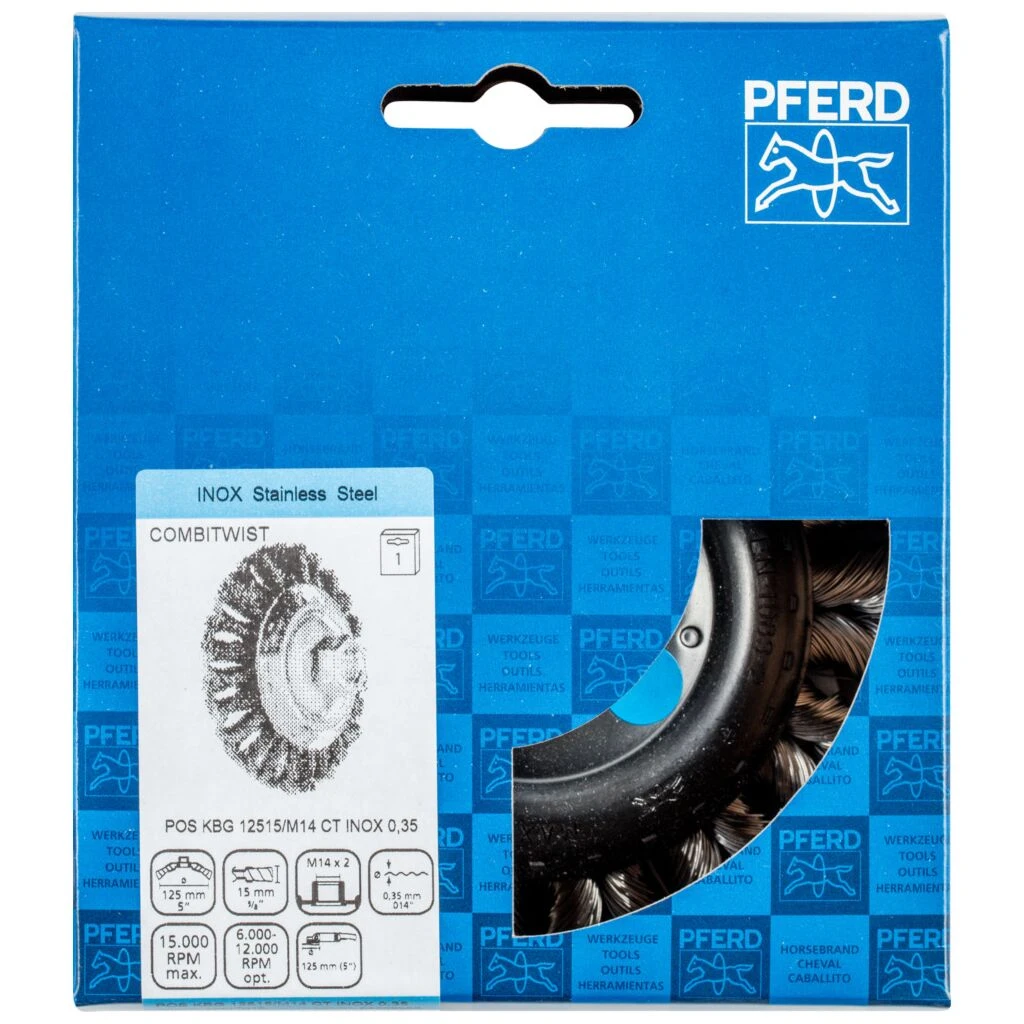 Sehr aggressiv arbeitende Bürste. Hervorragend für schwere Bürstarbeiten wie Entgraten, Reinigen, Entrosten und Entzundern sowie zum Entfernen von Schweißspritzern geeignet. Um die besonderen Ansprüche bei der Bearbeitung von Edelstahl (INOX) zu erfüllen, verwendet PFERD bei allen INOX-Bürsten die Drahtqualität 1.4310 (V2A). Praxiserfahrungen aus dem industriellen Umfeld bestätigen, dass sie eine sehr gute Korrosionsbeständigkeit bei optimaler Standzeit aufweist. Alle PFERD-Bürsten mit INOX-Besatz sind blau gekennzeichnet und für den Einsatz auf allen Edelstählen (INOX), wie z. B. V4A, geeignet. Die Drahtqualität 1.4310 neigt bei Kaltverfestigung zu ferromagnetischem Verhalten, das heißt, sie wird von Magneten angezogen.;Ursache hierfür ist eine Gefügeveränderung, die durch Verformung, z. B. während des Drahtziehens, hervorgerufen wird. Dies hat keinen Einfluss auf die Qualität und Korrosionsbeständigkeit des INOX-Besatzes. Er behält seine korrosionsbeständigen Eigenschaften. Edelstahldraht (INOX) hält Temperaturen bis 450 °C stand.