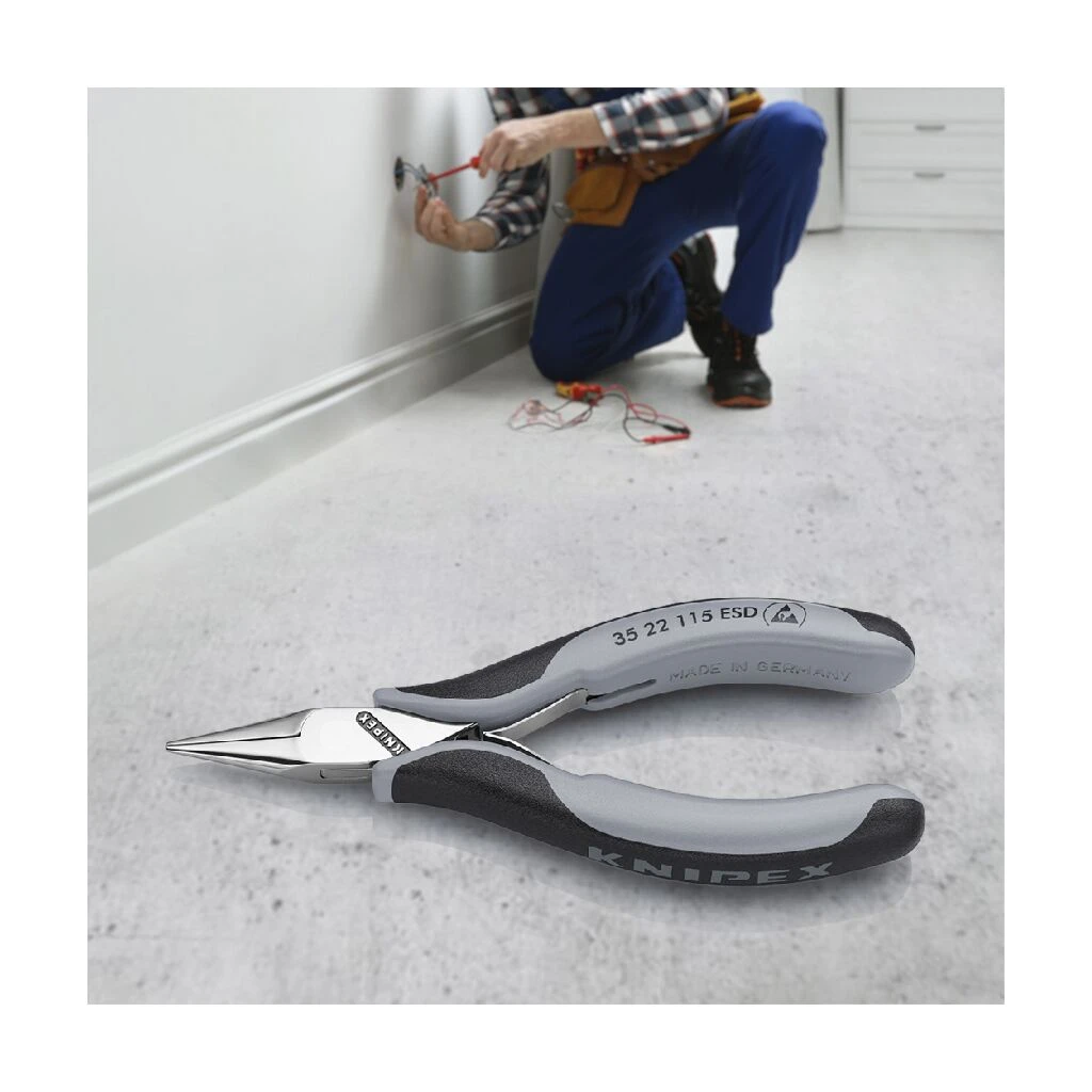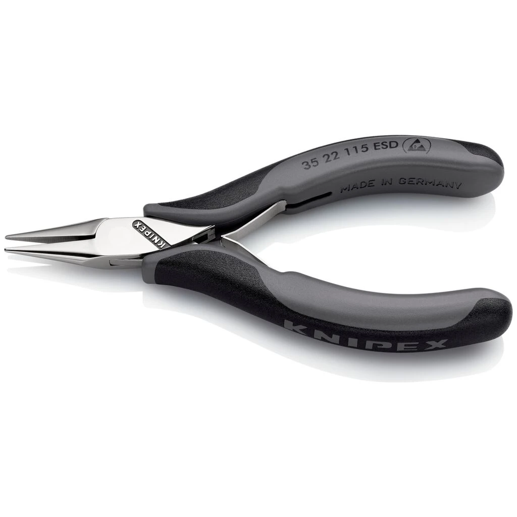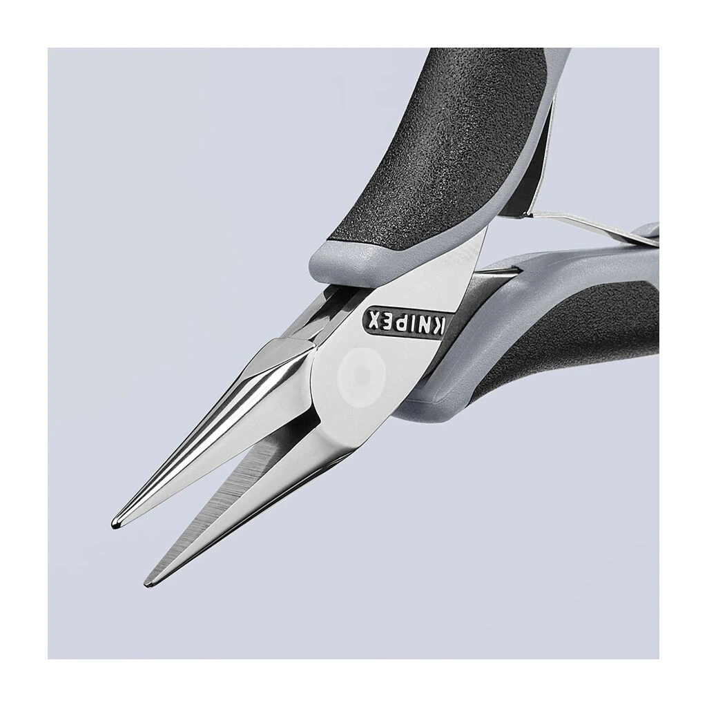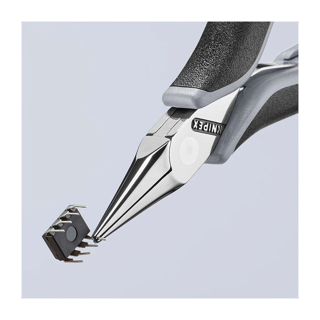 Präzisionszangen für feine Montagearbeiten, z. B. in Elektronik und Feinmechanik. Zum Greifen, Halten und Biegen. Griffe elektrisch ableitend – dissipativ. Durchgestecktes Präzisionsgelenk. Glatt geschliffene Greifflächen. Kanten sorgfältig entgratet. Reibungsarme Doppelfeder für ein sanftes und gleichmäßiges Öffnen. Die Spiegelpolitur bietet in Verbindung mit einem feinen Ölfilm einen guten Rostschutz – keine Störungen im Schaltkreis durch abblätternde Chromteile. Griffe mit zweifarbigen Mehrkomponenten-Hüllen schwarz/grau. flach-runde Backen.