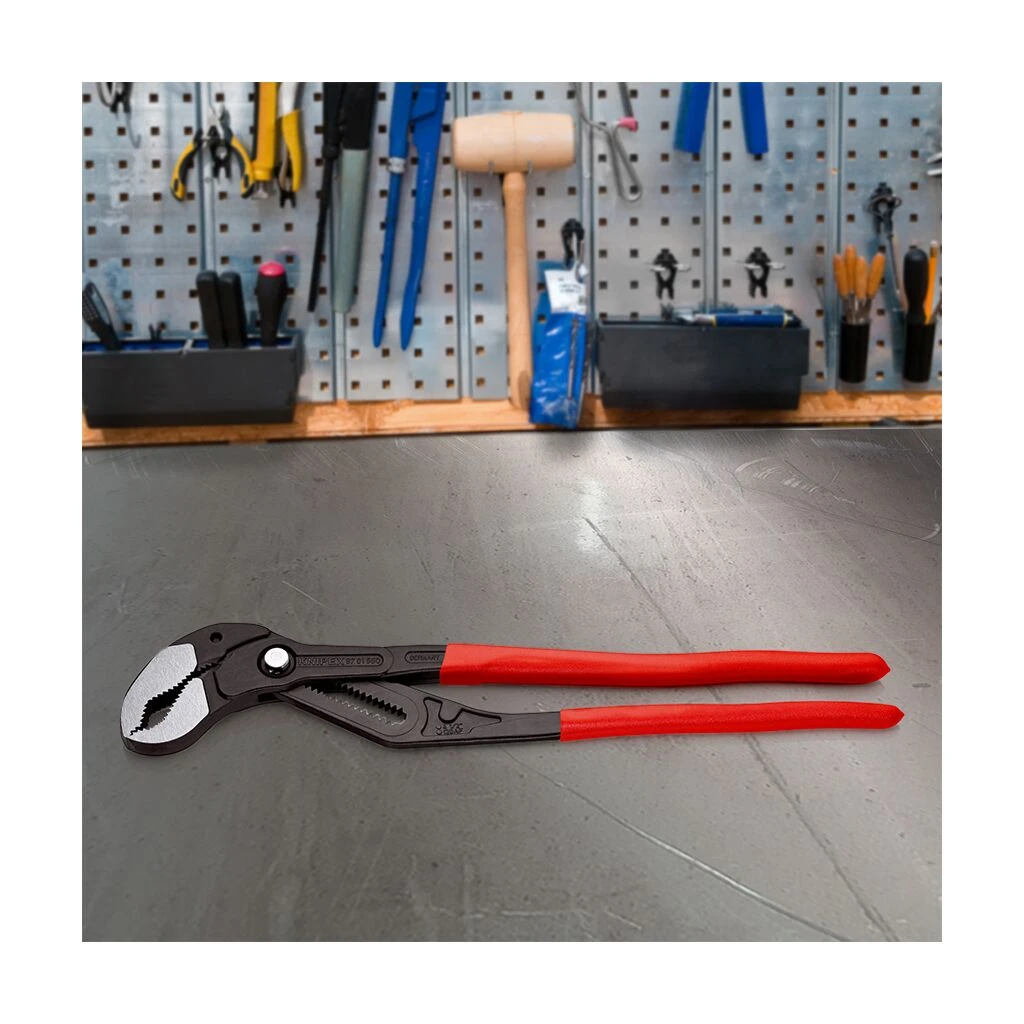 Größere Greifweite aber viel geringeres Gewicht als vergleichbare Rohrzangen. Schnelle Einstellung per Knopfdruck direkt am Werkstück, kein unbeabsichtigtes Durchrutschen des Gelenks. Feinverstellung für optimale Anpassung an verschiedene Werkstückgrößen und handfreundliche Griffstellung. Selbstklemmend an Rohren und Muttern: kein Abrutschen am Werkstück, kraftsparendes Arbeiten. Greifflächen mit spezialgehärteten Zähnen, Härte der Zähne ca. 61 HRC: dauerhaft sicheres Greifen durch hohe Verschleißfestigkeit. Durchgestecktes Gelenk: hohe Stabilität durch doppelte Führung. Klemmschutz verhindert Quetschverletzungen.