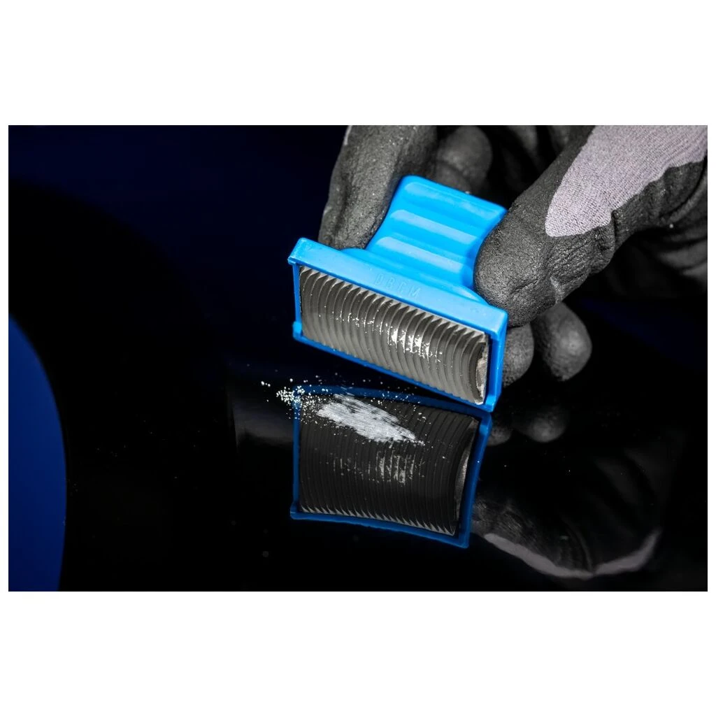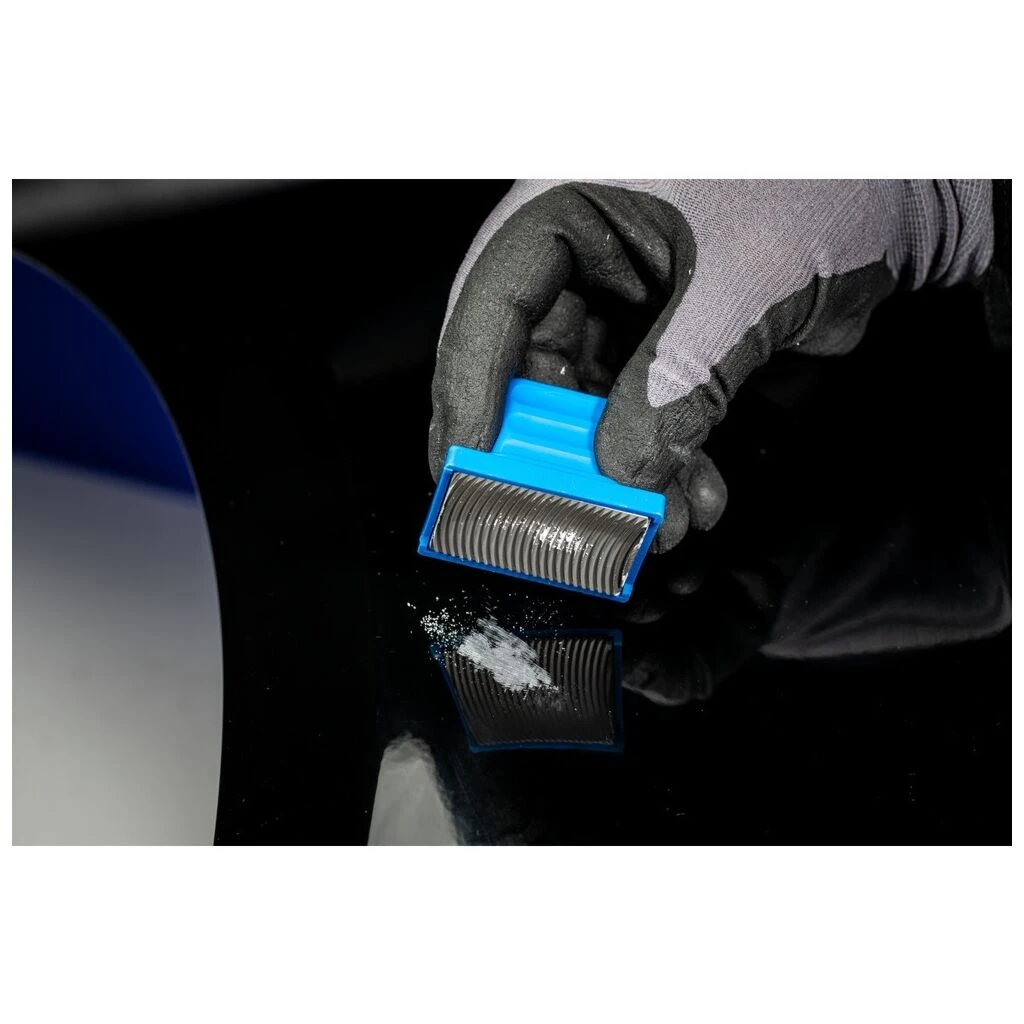 Set aus Lackhobel und Feile für Lackhobel. Die kleine Bauart des Lackhobels ermöglicht die Bearbeitung schwer zugänglicher Stellen. Er wird zur Feinbearbeitung kleinster lackierter Oberflächen mit dem zugehörigen Kunststoffhalter eingesetzt. Diese Kunststoffhalterung ermöglicht die sehr feine Justierung der Feile mittels zweier Stellschrauben. Zum Egalisieren, Korrigieren von Lackfehlern wie Verunreinigungen, Staubpartikeln und Luftblasen sowie zum Abtragen hauchdünner Lackschichten geeignet.