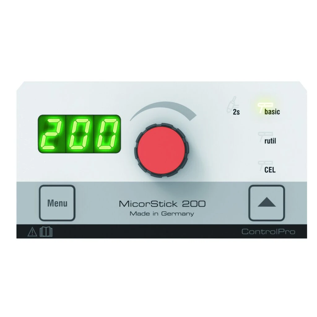 Bedienfeld mit „3 Schritte und Schweißen“-Bedienkonzept. Amperegenaue 7-Segment-Anzeige. Einfache Bedienung durch einen Knopf. Stufenlosverstellbare Stromeinstellungen. Elektrodenvorwahl für Standard (basisch und rutil) und CEL für optimale Schweißparameter. Mit WIG-DC-Schweißfunktion (mit ContacTIG). Untermenü für individuelle Anpassungen der Anlageneinstellungen.