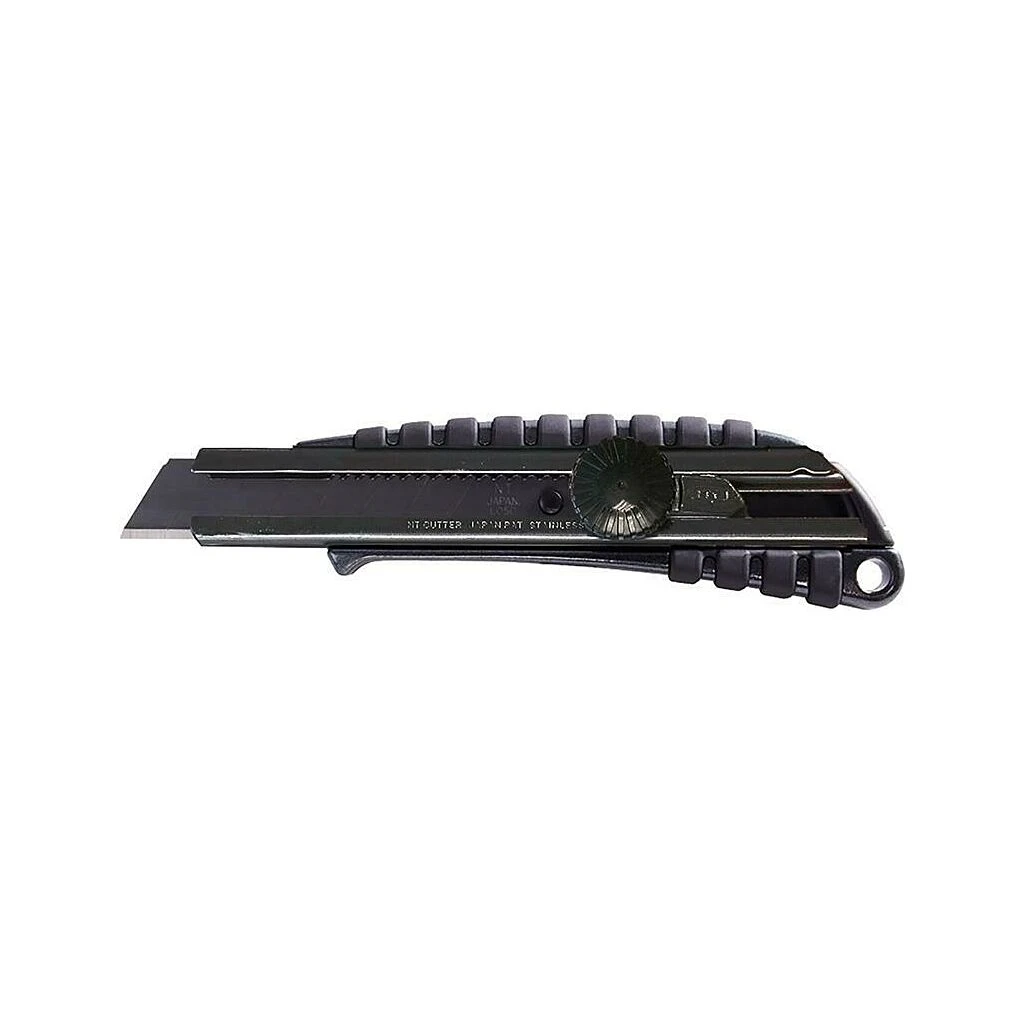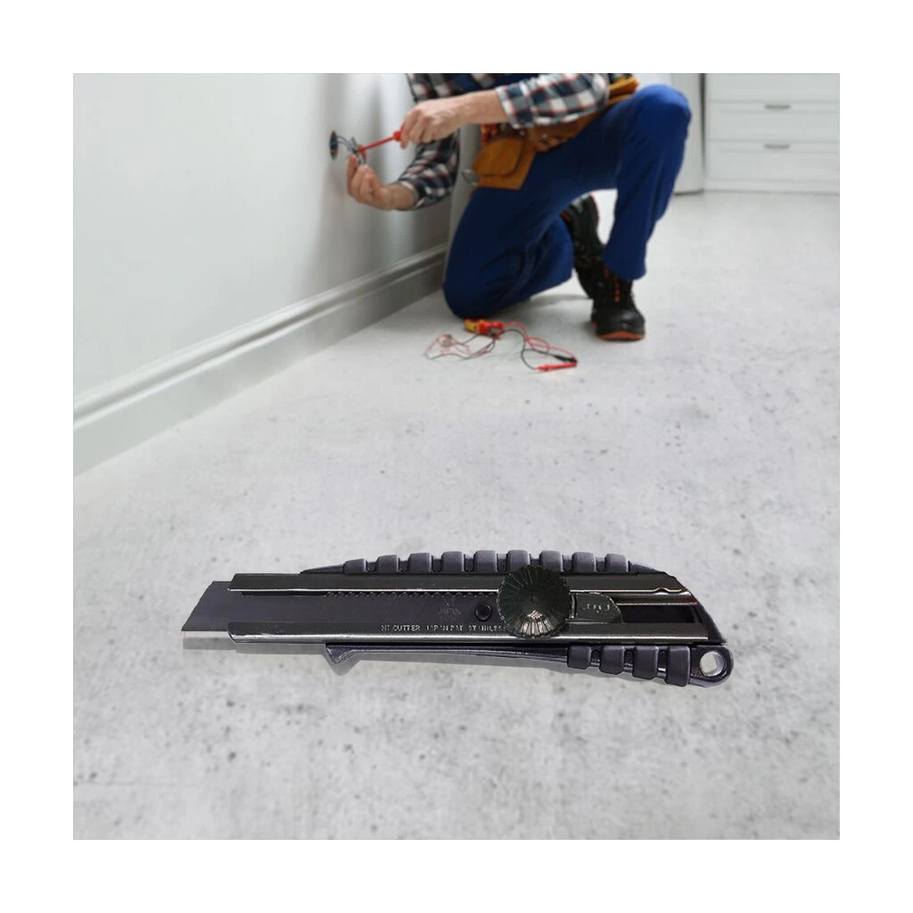 Ausführung: Aluminium-Druckgussgehäuse mit Gummieinlage. Metall-Klingenführung. Schwarze Klinge, besonders feine, scharfe Schneide. Fixierung der Klinge durch Feststellrad, mit Auto-Lock-Mechanismus. Lieferung mit 1 Abbrechklinge.
