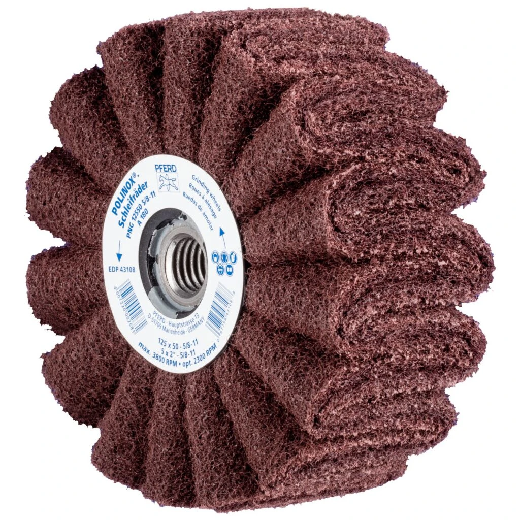 POLINOX-Schleifräder bestehen aus Polyamidvlies, in welches Schleifkorn eingebunden ist. Das Schleifvlies ist lamellenförmig radial angeordnet, wobei sich zwischen den Lamellen jeweils ein Schleifgewebe befindet. Durch diese Lamellenkombination ist ein höherer Materialabtrag realisierbar und die Oberfläche erhält ein gröberes Schliffbild. Das Werkzeug ist für die Bearbeitung mittelgroßer Flächen auf drehzahlregelbaren Winkelschleifern und Kehlnahtschleifern konzipiert und kann ohne weitere Spannmittel direkt auf die Arbeitsspindel der Antriebsmaschine montiert werden.