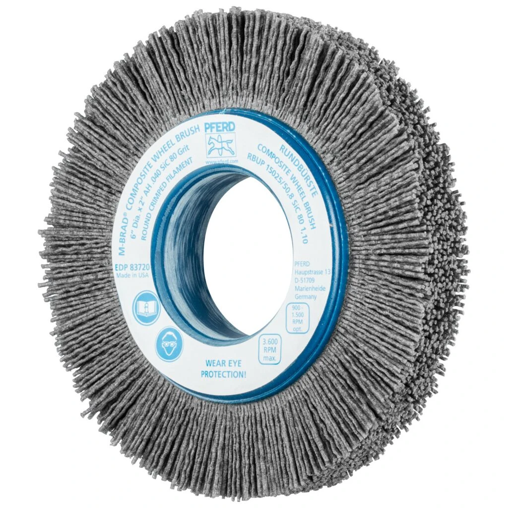 Besonders aggressiv arbeitende Bürste. Aufgrund des Kunststoffbesatzes besonders gut zum Entgraten von schwierig zu bearbeitenden Bauteilen wie Zylinderköpfen oder Zahnrädern sowie zur Oberflächenbearbeitung geeignet. Speziell für den industriellen Einsatz entwickelt. Composite-Bürsten von PFERD sind speziell für den industriellen, automatisierten Einsatz entwickelt. Sie eignen sich für eine Vielzahl von Bearbeitungsaufgaben und sind durch ihre variablen Aufspannmöglichkeiten auf vielen verschiedenen Antriebsmaschinen einsetzbar. Dies bietet den Vorteil, dass die Produktion und Nacharbeiten des Werkstückes auf der selben Maschine durchgeführt werden können. Hierdurch lassen sich lohnintensive, manuelle Arbeiten reduzieren und reproduzierbare Ergebnisse mit kurzen Taktzeiten erzielen. Für einen effizienten Einsatz müssen zahlreiche Anwendungsparameter wie z. B. Bearbeitungszeit und Vorschub aufeinander abgestimmt und die dazu passende Bürste ausgewählt werden. Bürsten mit Siliciumcarbid (SiC) eignen sich besonders gut für Entgratarbeiten und zur Oberflächenverbesserung. Kunststoffbesatz hält Temperaturen bis 220° C stand.