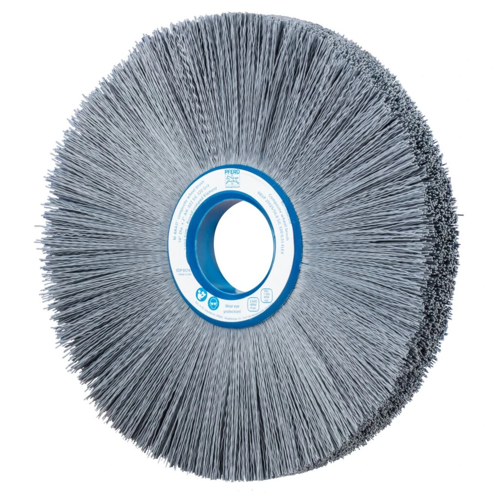 Besonders flexible Bürste. Aufgrund des Kunststoffbesatzes besonders gut zum Entgraten von schwierig zu bearbeitenden Bauteilen wie Zylinderköpfen oder Zahnrädern geeignet. Speziell für den industriellen Einsatz entwickelt. Composite-Bürsten von PFERD sind speziell für den industriellen, automatisierten Einsatz entwickelt. Sie eignen sich für eine Vielzahl von Bearbeitungsaufgaben und sind durch ihre variablen Aufspannmöglichkeiten auf vielen verschiedenen Antriebsmaschinen einsetzbar. Dies bietet den Vorteil, dass die Produktion und Nacharbeiten des Werkstückes auf der selben Maschine durchgeführt werden können. Hierdurch lassen sich lohnintensive, manuelle Arbeiten reduzieren und reproduzierbare Ergebnisse mit kurzen Taktzeiten erzielen. Für einen effizienten Einsatz müssen zahlreiche Anwendungsparameter wie z. B. Bearbeitungszeit und Vorschub aufeinander abgestimmt und die dazu passende Bürste ausgewählt werden. Bürsten mit Siliciumcarbid (SiC) eignen sich besonders gut für Entgratarbeiten und zur Oberflächenverbesserung. Kunststoffbesatz hält Temperaturen bis 220° C stand.