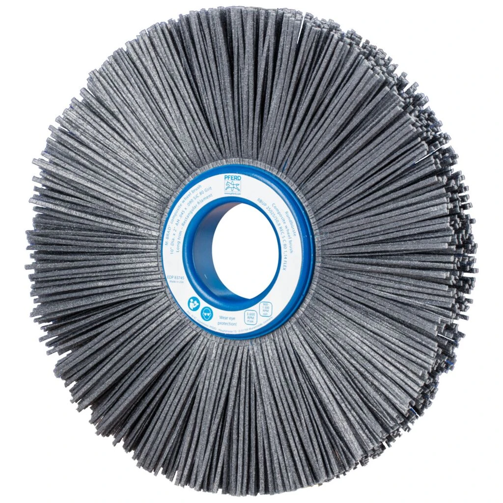 Besonders flexible Bürste. Aufgrund des Kunststoffbesatzes besonders gut zum Entgraten von schwierig zu bearbeitenden Bauteilen wie Zylinderköpfen oder Zahnrädern geeignet. Speziell für den industriellen Einsatz entwickelt. Composite-Bürsten von PFERD sind speziell für den industriellen, automatisierten Einsatz entwickelt. Sie eignen sich für eine Vielzahl von Bearbeitungsaufgaben und sind durch ihre variablen Aufspannmöglichkeiten auf vielen verschiedenen Antriebsmaschinen einsetzbar. Dies bietet den Vorteil, dass die Produktion und Nacharbeiten des Werkstückes auf der selben Maschine durchgeführt werden können. Hierdurch lassen sich lohnintensive, manuelle Arbeiten reduzieren und reproduzierbare Ergebnisse mit kurzen Taktzeiten erzielen. Für einen effizienten Einsatz müssen zahlreiche Anwendungsparameter wie z. B. Bearbeitungszeit und Vorschub aufeinander abgestimmt und die dazu passende Bürste ausgewählt werden. Bürsten mit Siliciumcarbid (SiC) eignen sich besonders gut für Entgratarbeiten und zur Oberflächenverbesserung. Rechteckiger Besatz [REC] eignet sich für Anwendungen, die besondere Ansprüche an die Aggressivität der Bürste stellen. Durch den größeren Querschnitt der Filamente sind diese steifer als runde Filamente und ermöglichen eine größere Kontaktfläche mit dem Werkstück. Kunststoffbesatz hält Temperaturen bis 220° C stand.