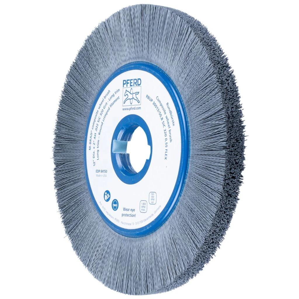 Besonders flexible Bürste. Aufgrund des Kunststoffbesatzes besonders gut zum Entgraten von schwierig zu bearbeitenden Bauteilen wie Zylinderköpfen oder Zahnrädern geeignet. Speziell für den industriellen Einsatz entwickelt. Composite-Bürsten von PFERD sind speziell für den industriellen, automatisierten Einsatz entwickelt. Sie eignen sich für eine Vielzahl von Bearbeitungsaufgaben und sind durch ihre variablen Aufspannmöglichkeiten auf vielen verschiedenen Antriebsmaschinen einsetzbar. Dies bietet den Vorteil, dass die Produktion und Nacharbeiten des Werkstückes auf der selben Maschine durchgeführt werden können. Hierdurch lassen sich lohnintensive, manuelle Arbeiten reduzieren und reproduzierbare Ergebnisse mit kurzen Taktzeiten erzielen. Für einen effizienten Einsatz müssen zahlreiche Anwendungsparameter wie z. B. Bearbeitungszeit und Vorschub aufeinander abgestimmt und die dazu passende Bürste ausgewählt werden. Bürsten mit Siliciumcarbid (SiC) eignen sich besonders gut für Entgratarbeiten und zur Oberflächenverbesserung. Kunststoffbesatz hält Temperaturen bis 220° C stand.