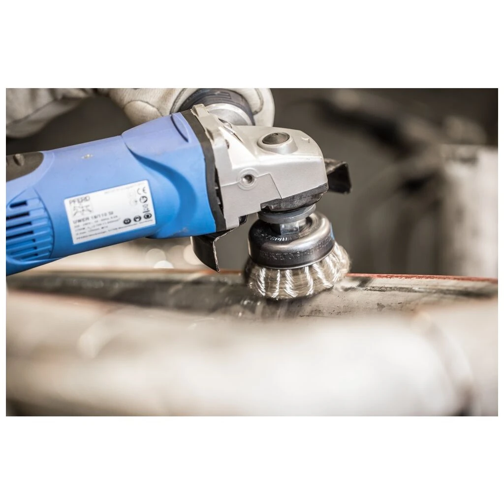 Aggressiv arbeitende Bürste. Hervorragend für schwere Bürstarbeiten wie Entgraten, Reinigen, Entrosten und Entzundern sowie zum Entfernen von Schweißspritzern geeignet. Um die besonderen Ansprüche bei der Bearbeitung von Edelstahl (INOX) zu erfüllen, verwendet PFERD bei allen INOX-Bürsten die Drahtqualität 1.4310 (V2A). Praxiserfahrungen aus dem industriellen Umfeld bestätigen, dass sie eine sehr gute Korrosionsbeständigkeit bei optimaler Standzeit aufweist. Alle PFERD-Bürsten mit INOX-Besatz sind blau gekennzeichnet und für den Einsatz auf allen Edelstählen (INOX), wie z. B. V4A, geeignet. Die Drahtqualität 1.4310 neigt bei Kaltverfestigung zu ferromagnetischem Verhalten, das heißt, sie wird von Magneten angezogen.;Ursache hierfür ist eine Gefügeveränderung, die durch Verformung, z. B. während des Drahtziehens, hervorgerufen wird. Dies hat keinen Einfluss auf die Qualität und Korrosionsbeständigkeit des INOX-Besatzes. Er behält seine korrosionsbeständigen Eigenschaften. Edelstahldraht (INOX) hält Temperaturen bis 450 °C stand.