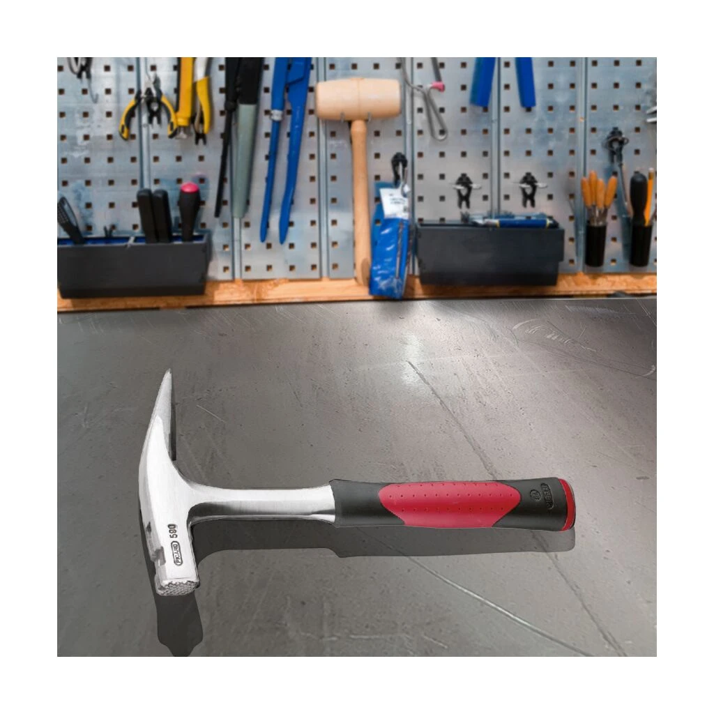 Aus einem Stück geschmiedet mit magnetischem Nagelhalter. Stahlrohrstiel mit schwingungsdämpfendem 2-Komponenten-Griff.