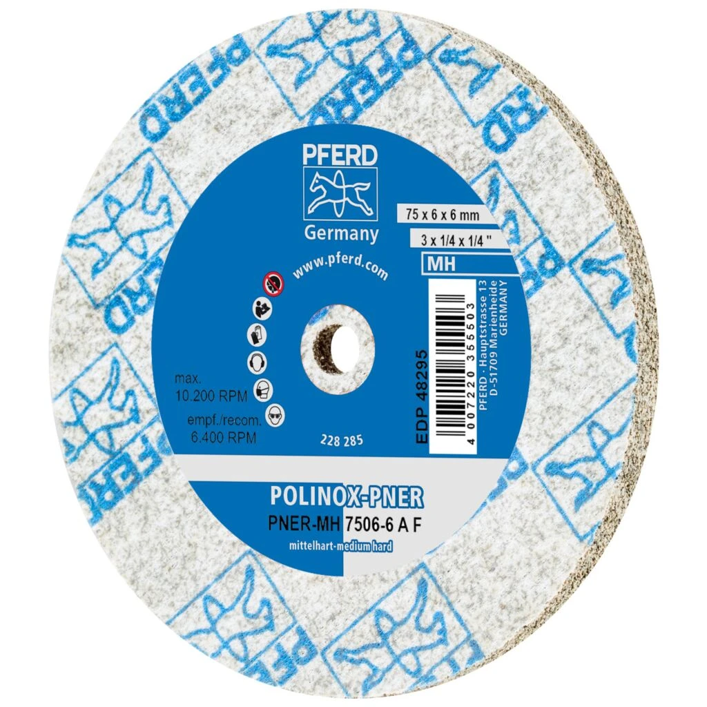 POLINOX-Kompaktschleifräder PNER bestehen aus mehreren stark komprimierten Vliesschichten, die mit einem speziellen Korn-Harz-System gebunden sind. Durch unterschiedliche Kombinationen aus Verdichtung, Fasern, Korn und entsprechender Bindung entstehen Vliesprodukte mit sehr gutem Oberflächenfinish, hoher Abtragsleistung und hoher Standzeit. Mit diesen Werkzeugen kann ein breites Spektrum bei der Oberflächenbearbeitung, vom relativ groben Schliff bis zur Vorbereitung zum Polieren, abgedeckt werden. Die Ausführung für Geradschleifer, Biegwellen und Schleifböcke ist besonders für die Bearbeitung kleinerer Flächen geeignet. Mittelharte Ausführung mit erhöhter Kantenfestigkeit und Standzeit für raue Entgrat- und Putzeinsätze.