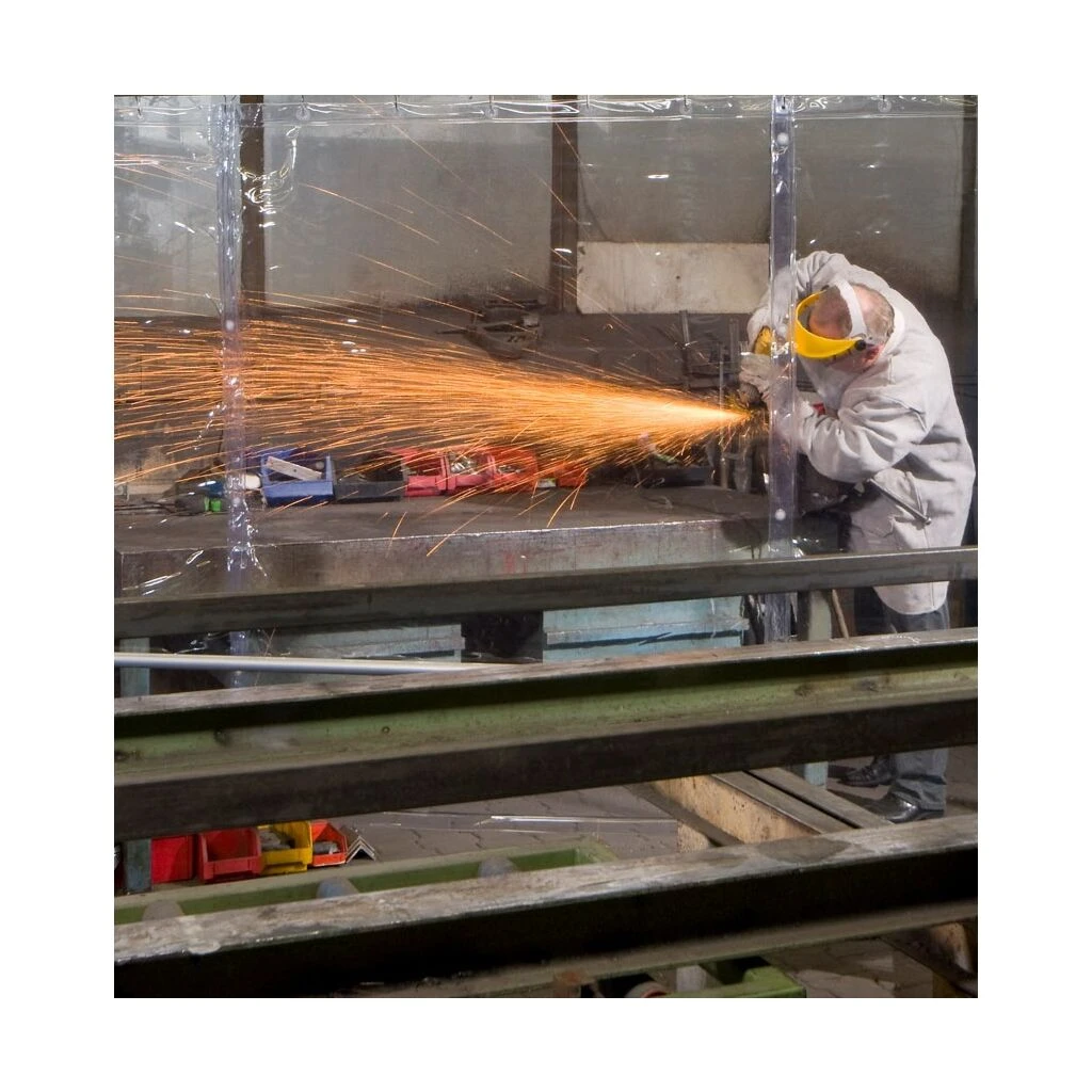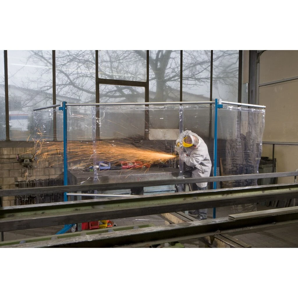 Die Oberkante des Vorhangs ist mit äußerst stabilen, eingeschweißten Kunststoffringösen versehen. Die Aufhängung am C-Profil erfolgt mit Kunststoff-PA-Haken. Der Schweißer-Schutzvorhang lässt sich wie bei einer Gardine einfach in die Parkstellung verschieben und besitzt spezielle Laufrollen für größere Höhen. Eine Befestigung an Rohr- oder Schutzgittern ist mit Karabinerhaken möglich.