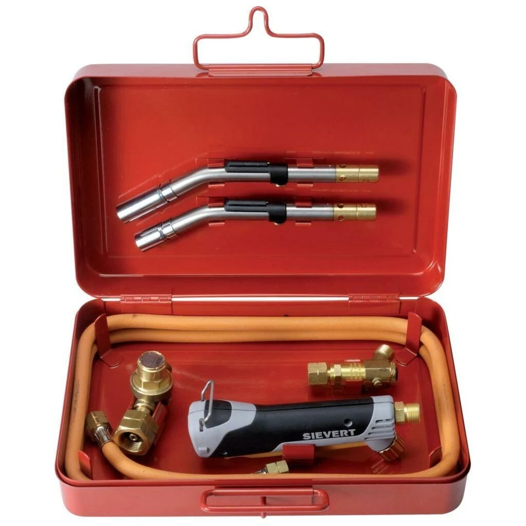 Lieferumfang: Piezo-Handgriff, Zyklonbrenner Ø 19 mm, Weichlötbrenner Ø 19 mm, Druckregler 2 bar mit Schlauchanschluss 3/8″ li, Schlauchbruchsicherung 2 bar R3/8″ x 3/8″ li, 2-m-Propanschlauch, Stahlblechkasten.