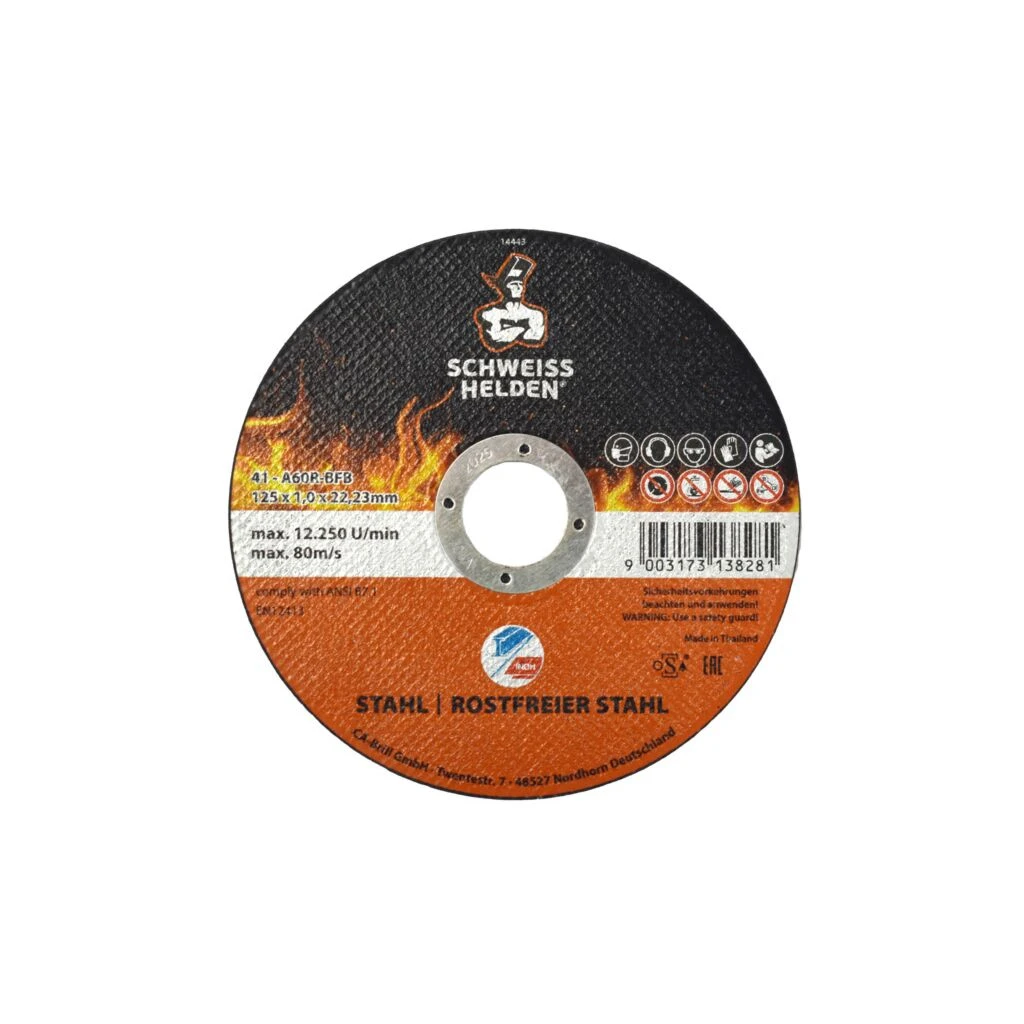 Die neue SCHWEISSHELDEN Trennscheibe für Edelstahl verwenden Sie zum Trennen von Blechen, Profilen, Rohren, Stäben mit kleinen Durchmessern und Vollmaterial. Die chemische Reinheit dieser Werkzeuge ist für die Bearbeitung von rostfreien Stahlsorten Voraussetzung, um negative Werkstoffbeeinflussung wie Korrosionsbildung, Lochfraß oder Reduktion der Dauerfestigkeit zu vermeiden. Die 1,0 mm starken Trennscheiben sind besonders für schnelles, komfortables und gratarmes Trennen geeignet.