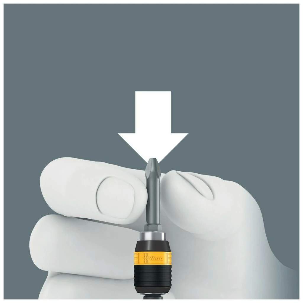 - Zum Bitwechsel einfach die Hülse nach vorne schieben: Dabei hebt der Federmechanismus den Bit vom Magneten ab und entriegelt das Werkzeug. Der Bit kann problemlos entnommen werden. Besonders hilfreich: Mühelose Entnahme auch kleinster Bitgrößen ohne Hilfswerkzeug.