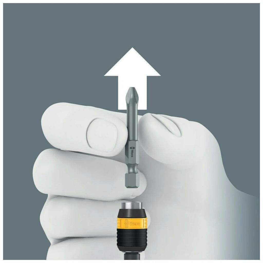 - Die Rapidaptor Schnellwechselhalter nehmen sowohl ¼“-Bits nach DIN ISO 1173-C 6,3 und E 6,3 sowie Wera Reihe 1 und 4 auf.