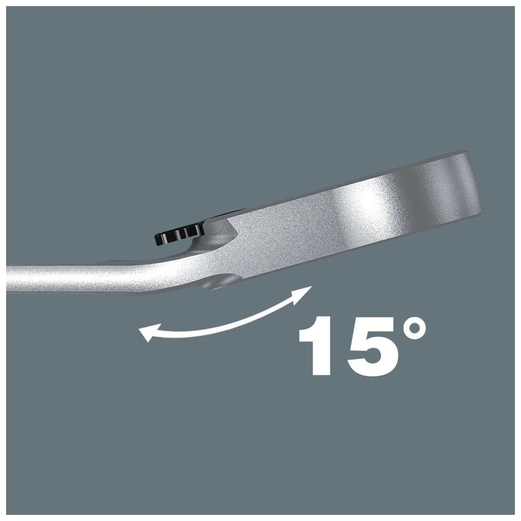 - Die Ringseite ist um 15° abgewinkelt zur Werkzeugachse angeordnet, um das Ansetzen des Schlüssels bei beengtem Arbeitsraum zu erleichtern.