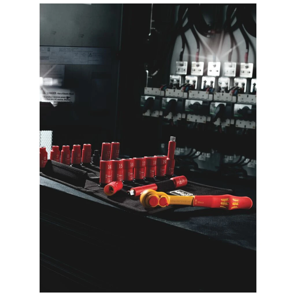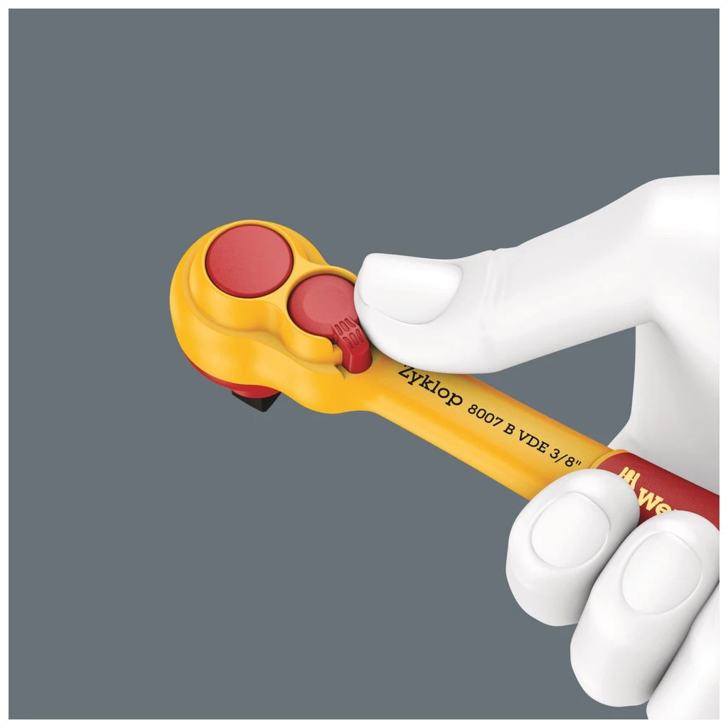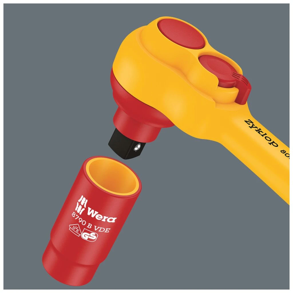 1 Zyklop Knarre 8007 B VDE, mit Umschalthebel, mit 3/8″-Antrieb, 14 Zyklop VDE-Nüsse, je 1 Zyklop VDE-Verlängerung lang und kurz, alle Werkzeuge isoliert, stückgeprüft gemäß IEC 60900 bei 10.000 V für sicheres Arbeiten bei der zugelassenen Spannung von 1.000 V. Die Zyklop VDE-Nüsse und -Verlängerungen bieten erhöhte Sicherheit durch 2-komponentige Isolation mit gelbem Isolationskern unter roter Isolationsaußenschicht, der bei einer eventuellen Beschädigung der äußeren roten VDE Isolationsschicht sichtbar wird.